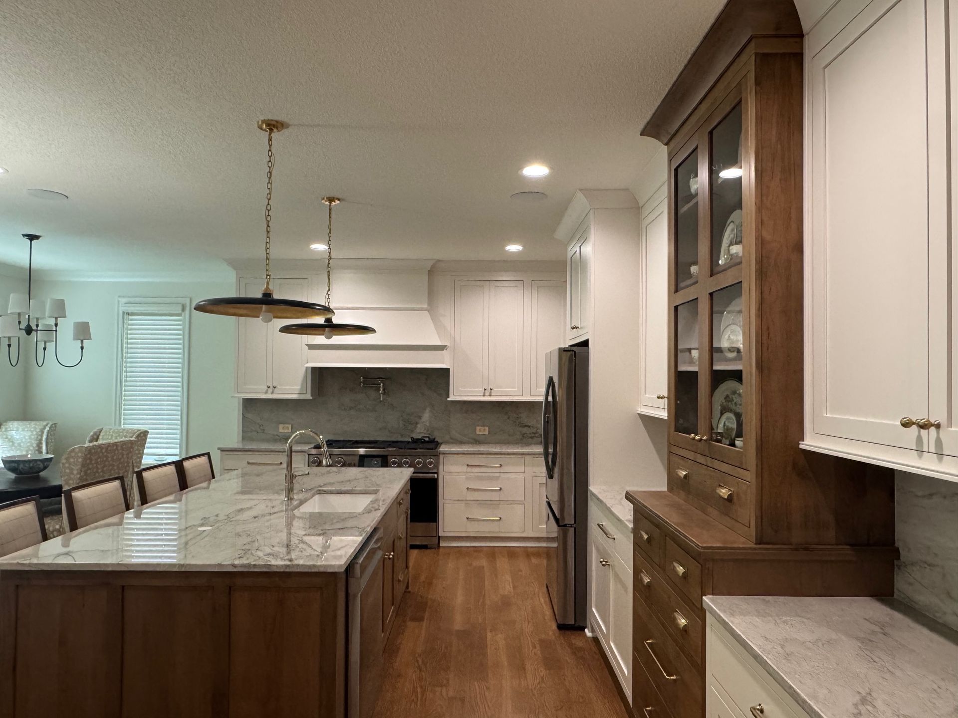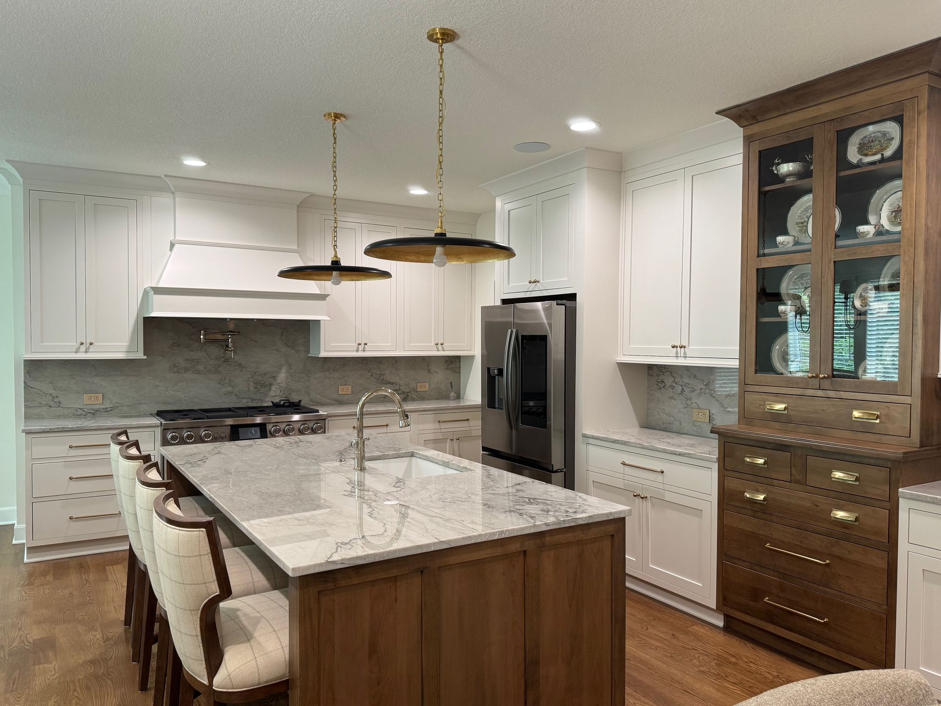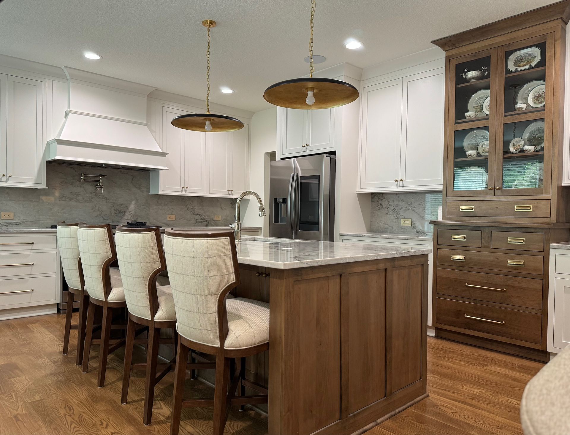 The island was redesigned to improve flow and expand counter space, making cooking and hosting effortless. Crafted from Alder and finished with a rich stain, it features integrated end panels and decorative base molding, giving it the presence of a freestanding furniture piece. A custom furniture-style hutch, built to the homeowners’ exact specifications, showcases their